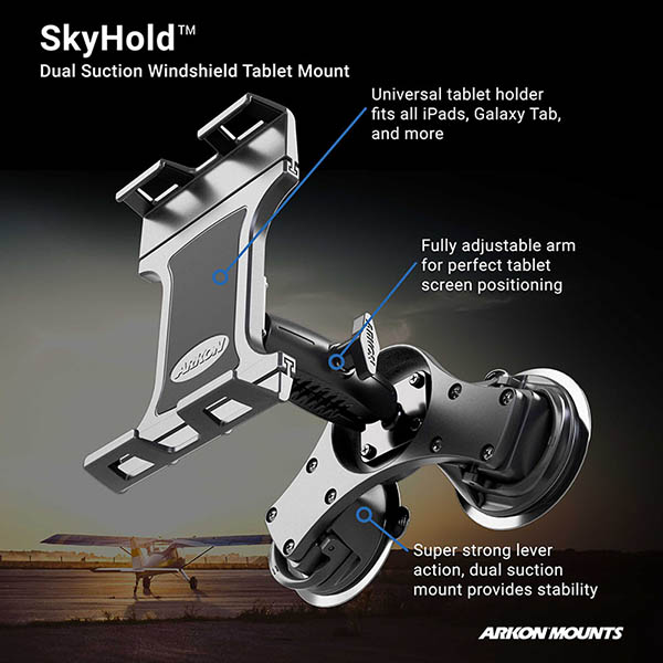 Whether you're a weekend flyer, an aircraft newbie, or a professional pilot, the SkyHold™ Windshield Dual Suction Tablet Mount is the ultimate aviation tool for installing your tablet in your cockpit. It fits a range of tablet models up to 7" to 18.4" in screen size, and thanks to a strong double suction mount, it fixes securely to your aircraft's windshield.