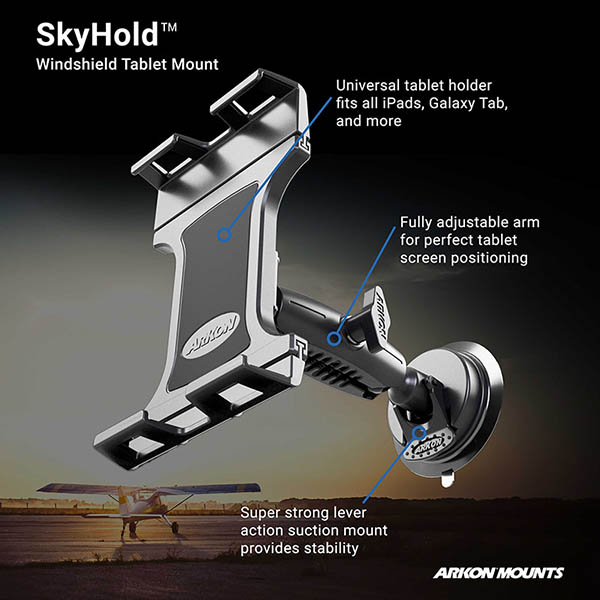 | Pilots, experience the SkyHold™ Windshield Suction Tablet Mount, the secure and safe way to mount your tablet in your airplane, helicopter, or glider. It fits a range of tablet models with 7" to 18.4" screen sizes, and its strong suction mount firmly grips to your aircraft's windshield. The ultimate tool for quickly accessing all your essential in-flight information. Secure Flight Tablet Holder The Slim-Grip® Ultra Pro Universal Tablet Holder, made from robust reinforced composite, is designed to securely fit tablets ranging from 7" to 18.4", such as the iPad and Galaxy Tab. Its straightforward design includes a spring-loaded mechanism that ensures your tablet remains firmly in place while you operate the aircraft. The spring-loaded mechanism allows for easy one-handed insertion and removal of your tablet. Push down on the holder's lower leg and release, making it an ideal choice for pilots with a busy flight schedule. Multiple Support Legs This tablet holder designed for aircraft comes with four adjustable support legs—two short and two long—allowing customization for various tablet makes and models. Choose the best combination of legs to ensure a secure grip for your tablet and unobstructed access to its buttons and ports. Use the two short legs for tablets with heights between 6.56" and 8.94". One long and one short leg are recommended for devices ranging from 7.03" to 9.875" in height. Adjustable Robust™ 3.75" Shaft Featuring a sturdy Robust™ 3.75" mount shaft, this iPad airplane holder can be adjusted and positioned once attached to your aircraft's windshield. The shaft has a double-ball swivel at both ends, enabling 360° rotation and allowing you to position the tablet from any angle. The number one aviation tablet tool for quickly accessing your in-flight apps and weather information without getting in the way of your line of sight. Strong Windshield Suction Mount This airplane tablet holder firmly attaches to your cockpit's windshield with an 80mm sticky suction base and a one-touch lever for easy installation. It is designed to endure hot and cold climates and consistently delivers a remarkable 69 lbs pull force. This suction mount ensures exceptional stability for pilots while in the air, even if the flight is turbulent or runs into bad weather. |