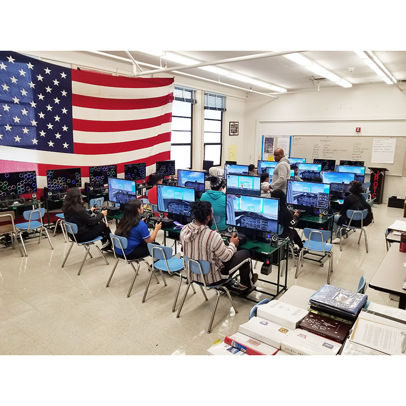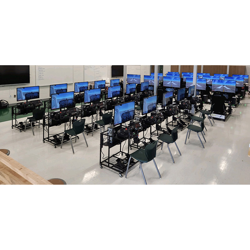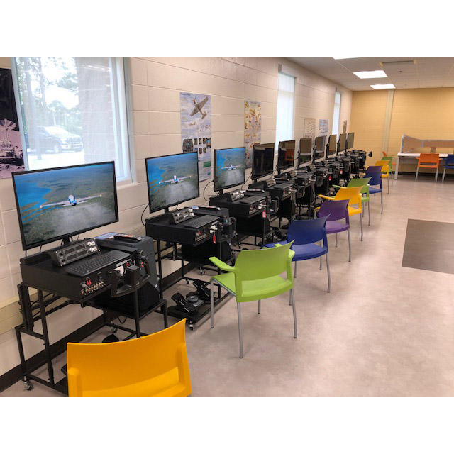 The Edustation comes with a 32" HD forward view capable of flying every airfield on the planet in one of 50+ aircraft. Includes our K12 Curriculum book, NGSS aligned multimedia lesson plans and tutored simulator learning missions. Include delivery to your school. We like students to form into “Flight Crews” of 3 or 4 students. This allows them all to succeed in Collaborative Learning. Therefore 20 students in crews of 4-5 simulators, 30 students in crews of 3-10 simulators. STUDENTS APPLY CLASSROOM MATH, SCIENCE AND ENGINEERING BY LEARNING TO FLY The Edustation is capable of flying from every airfield on the planet in one of 50+ aircraft. Students will plan and fly flights using basic algebra, geometry, trigonometry, physics, geography and topography. Edustations are designed for classrooms where they can be nested together. Each Edustation has our tutored simulator learning missions teaching all of the fundaments by flying through boxes in the sky. Using our Visual learning First Education approach engages students by watching a video of the content before reading it. Our curriculum is used in STEM labs, Science/Physics/ Engineering Design classrooms, Flying/Aviation Clubs, after school programs and in JROTC program. By teaching the principles of flight leverages STEM concepts in; geometry, algebra, trigonometry, physics, meteorology, geography and topography. Dimensions: 30.5” wide, 31” long, 58” high |