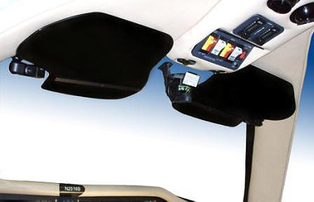 Rosen, the company that makes transparent visors for all major business jet models, has introduced its Sunvisor System for the Cessna 350/400 singles. The darkly tinted visor panels are mounted on articulating arms designed exclusively for the 350/400 so they can be positioned exactly between the pilot's eyes and the sun. The visor lens is approximately 9 by 13 inches, though it is uniquely shaped to fit the 350/400 cockpit and window shape. The Sunvisor is approved for installation under an STC. |