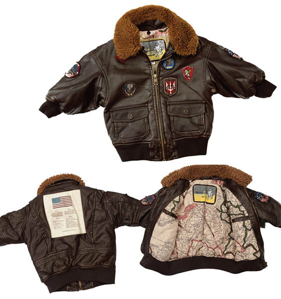 | For the Top Gun of the future, this adorable jacket is a must have! The Top Gun G-1 jacket was designed and created for the US Navy's elite Fighter Jocks.The numerous patches certify the service history of the Navy's best pilots and is worn with great pride. Lining illustrates escape map of Western Europe. |
