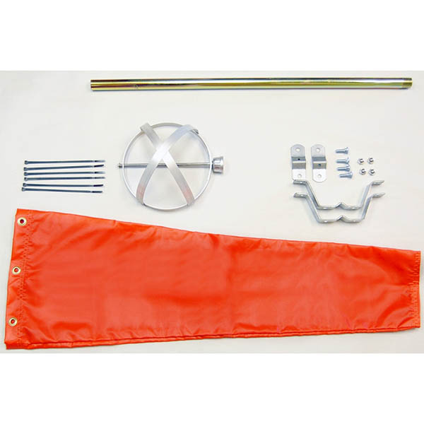 | These complete USA made windsock kits include our aviation quality orange windsock, standard aluminum frame, heavy duty windsock ties, 30" long galvanized pole with 3/4" pipe thread, and mounting brackets. They are a stand alone unit for mounting on a flat vertical surface. Windsock size 18" diameter by 48" long. |