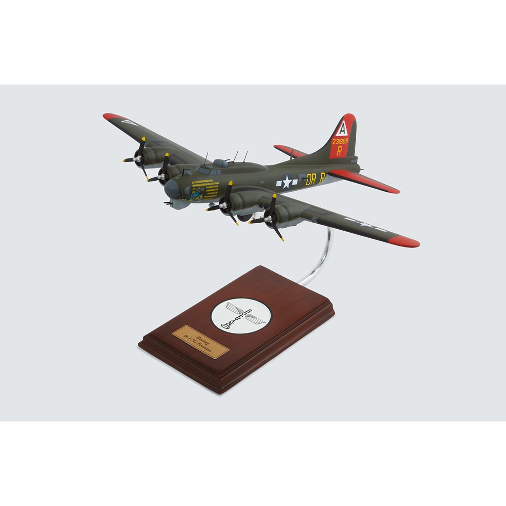 This collectible 1/62 scale model of the B-17 represents one of the iconic aircraft of World War II, Boeing’s Flying Fortress. This model B-17G shows “Nine O’Nine,” a B-17G owned and operated by the B-17F Memphis Belle, recalled in his 2001 autobiography his reaction to seeing the B-17. “All those other planes that had seemed so intoxicating when I was cutting my teeth on them – the yellow PT-17s, the Lockheed Hudson, all the rest of them—well, it was as if they never existed.” Morgan wrote in “The Man Who Flew the Memphis Belle.” “One look at the B-17, silver and elegant and indomitable-looking on the tarmac, bristling with armature, that massive reassuring tailfin crowning its splendid architecture, and the world started all over again.” As far as its nickname “Flying Fortress,” Morgan wrote, “To me and the thousands of men who flew her, “goddess,” would not have been overdoing it.” Although the British used a few B-17Cs as early as 1941, it remained for the Eighth Air Force to bring the B-17 into its own. The first American B-17 unites began arriving in England in May 1942, with the first mission – to bomb railroad yards in France – flown on Aug. 17, 1942. Then-Maj. Paul Tibbets, who would fly the B-29 Enola Gayto drop an atomic bomb on Hiroshima, led the mission. It would be almost another year before the Eighth Air Force would begin its bombing offensive against Germany in earnest. By the summer and fall of 1943, large formations of B-17s were flying missions deep into Germany. A lack of fighter that could escort the bombers to the target and back added to the vulnerability of the bomber formations and despite the heavy firepower on each B-17, losses were heavy. On Oct. 14, 1943, 59 bombers out of 291 launched were lost on a mission to bomb ball-bearing factories in Schweinfurt. The losses forced a suspension of raids into Germany until long-range fighter escorts were available. In 1944 and 1945, formations of hundreds of B-17s were again flying deep into Germany, with long-range P-51 Mustang fighters helping ease losses. By war’s end, the B-17 was obsolete, with the B-29 Superfortress supplanting it as the nation’s top-of-the-line bomber. Thousands were scrapped, but others flew on as drones, drone controllers and rescue craft, as well as in other support roles. The last operational B-17 mission by the U.S. Air Force was flown on Aug. 6, 1959, when a B-17 controlled a drone B-17 as a target for an air-to-air missile test. The original Nine O’Nine served with the 91st Bomb Group, completing 140 missions – more than any other B-17 – and never lost a crewman. The current Nine O’Nine was accepted for military service on April 7, 1945, too late for war service. She was configured for air-sea rescue, and was later used as a weapons effects test article for three separate nuclear tests in the 1950s. After 13 years to let the airframe “cool down” in radioactivity, it was sold as part of an 800-ton scrap pile – but restored to flying condition as a firefighting tanker. In 1986, after 20 years as a fire bomber, the Collings Foundation bought the aircraft and restored to her wartime configuration by Tom Reilly Vintage Aircraft. |