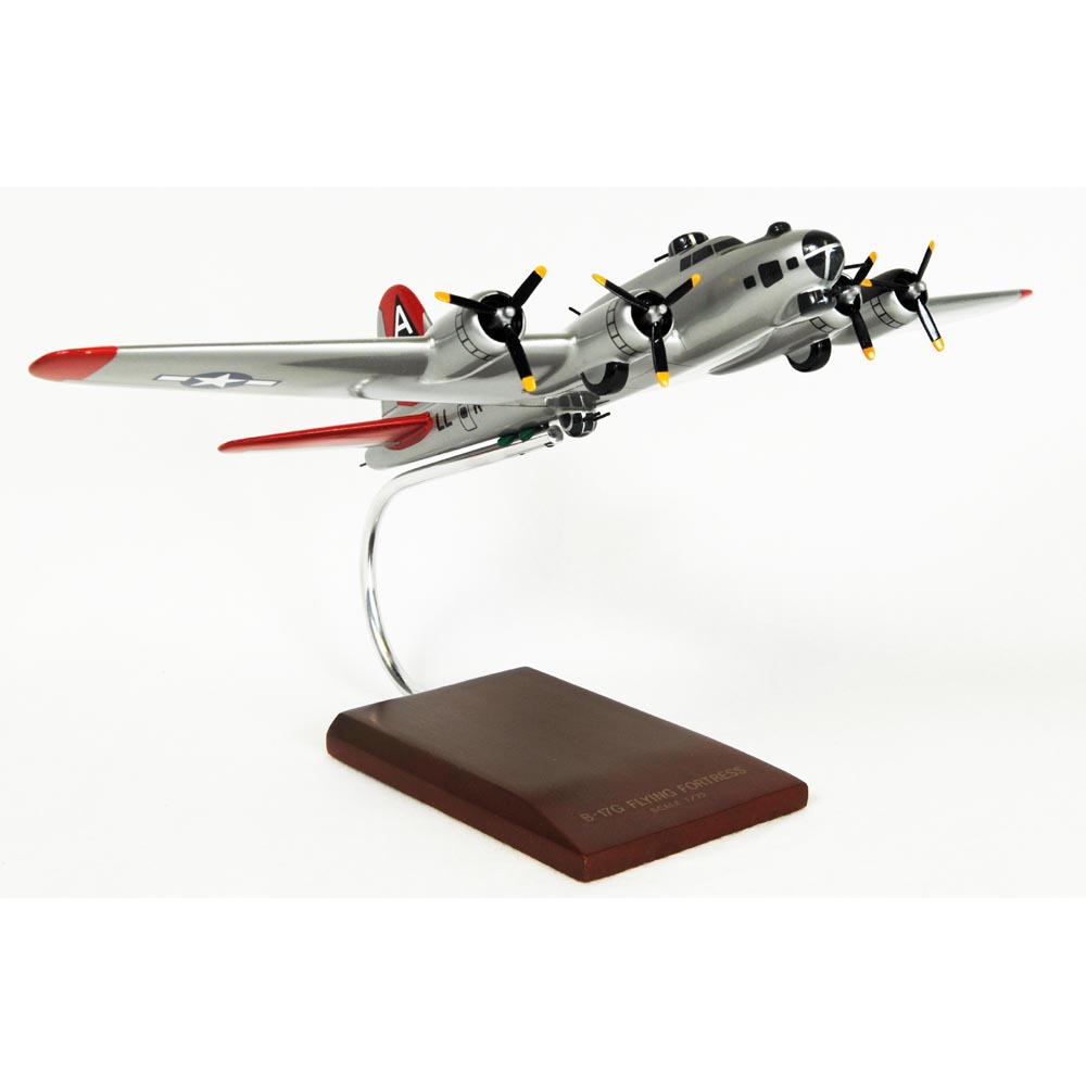 This high quality replica is handcrafted from mahogany and comes with a wooden base. Length is 12" and wingspan is 17-1/4". Scale is 1/72. The Boeing B-17 Fortress is a long range heavy bomber. The B-17G has a defensive firepower of not less than thirteen 0.50-inch machine guns, two chin guns, two guns in the dorsal turret, two guns in the ventral turret, two guns in the waist, two guns in the tail and one gun in the roof of the radio operators position. The B-17 has a maximum speed of 472 km/h. The B-17 has crew of six to ten. It incorporates four 1,200 h.p. Wright R-1820-97 nine-cylinder radial air-cooled engines with General Electric Type B-22 exhaust-driven turbo-superchargers. In July 1943, the B-17G was introduced to Fortress production line and was produced in large numbers than any other Fortress variant. B-17G entered service with the Eighth and Fifteenth Air Forces in late 1943. In 1945, when the production of B-17G ceased , theres a total of 4,035 B-17Gs built. |