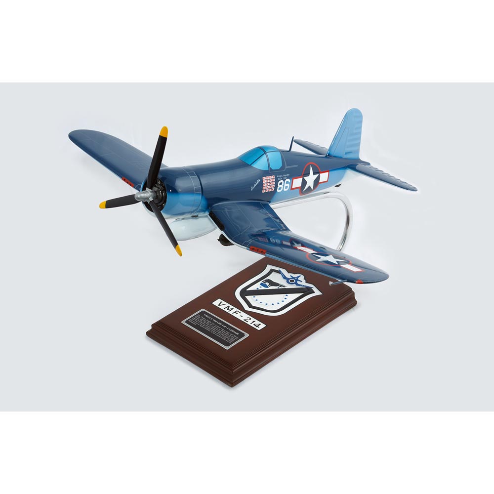 The F4U Corsair is a carrier-based fighter aircraft manufactured by Chance Vought in 16 separate models. The F4U-1 variant was the first Corsair with the original cockpit seat height and bird cage canopy. The F4U-1 was based on the X4U it has a larger fuel tank and the removal of its fuselage windows behind the canopy and a modified armament with six Browning MG53-2 0.50 machine guns. Gregory ""Pappy"" Boyington was credited for 22 kills in F4Us. The F4U Corsair was in active service in early 1943 and the first combat engagement was on February 14, 1943. F4U Corsair served as fighter bombers in the Central Pacific and the Philippines. In the beginning of 1945, the Corsair performed strikes with high-explosive bombs, napalm tanks and HVARs and its versatility made it a prominent participant in the fighting for the Palaus, Iwo Jima and Okinawa Prefecture. The F4U Corsair quickly became the most capable carrier-based fighter-bomber of World War II. F4U Corsairs saw service with the US Navy, US Marines, Fleet Air Arm and the Royal New Zealand Air Force, French Aeronavale and other postwar services. |