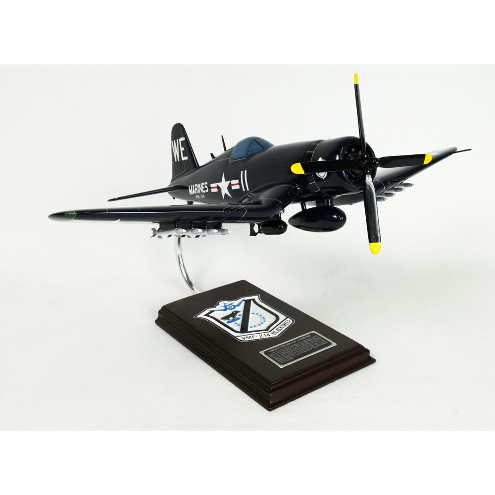 The F4U Corsair has proven to the most capable capable carrier based fighter of World War II. In June 1942, the first production of the F4U-1s were delivered. The famous ""Black Sheep"" squadron of book and TV series fame immortalized the Corsair in the blue South Pacific skies. The F4U-4 was the definitive version of the F4U Corsair. It features a four-bladed Hamilton Standard Hydromatic propeller, a new cockpit layout, a clear view sliding hood, a two stage turbo-supercharged engine and under wing attachment points for 8-5 inch rockets or bombs. Most F4U-4s retained the standard armament of 6- .50 caliber wing mounted machine guns. The F4U-4 incorporates a Pratt & Whitney R-2000-18W. It has a maximum speed of 435 mph at 15,000 ft and a range of 1,005 miles at 214 mph at 15,000 ft. The Corsair was one of the great fighters of World War II and was proven much later in its service during the Korean War. |