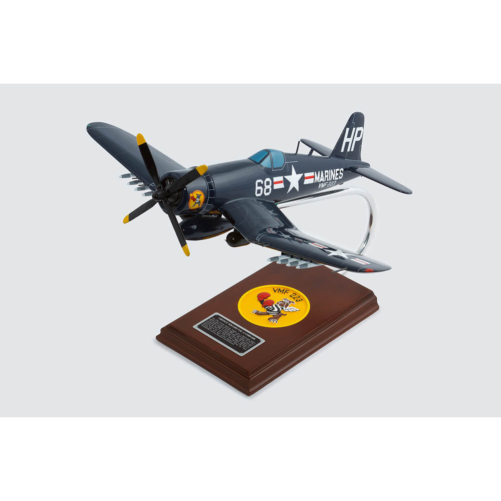 The F4U Corsair was the result of a 1938 United States Navy (USN) requirement for a new carrier aircraft that could match the performance of the best land and carrier-based fighter planes. Designed by Rex Buren Beisel and manufactured by Chance Vought, it was made to carry the most powerful engine and largest diameter propeller ever built at that time. Although designed as a carrier fighter for the USN, concerns about its landing and visibility characteristics led it to be used initially by the United States Marine Corps (USMC), which operated on land-based runways.  In March 1943, the Marines introduced the aircraft to its debut combat. Eventually it was put into service with the USN in January 1944, after the British proved that it was able to operate safely from carriers. The plane was not slow to prove its fighting ability and succeeded in gunning down 2,140 enemy aircraft while losing only 189 F4Us during World War II. Consequently, 24 Corsair pilots became air aces. The Corsair was given the nicknames “The Sweetheart of the Marianas” and “The Angel of Okinawa” by allied ground forces. The Japanese troops dubbed it “Whistling Death” because of the sound that it made during dive-bombing or strafing runs. The F4U-4 was the last variant to be produced during World War II, entering service just four months before the end of hostilities. With a rate-of-climb of nearly 4,000 feet per minute and a service ceiling of 41,500 feet, it was the Navy’s answer to the much improved Japanese fighters that were arriving in the Pacific. In addition to a new propeller, the F4U-4 had a completely redesigned cockpit, a new canopy for improved bubble effect, a new armor-plated bucket seat, and regrouped instruments. Improved fighter-bomber capabilities were made possible by putting rocket stations on the outer wing panels. The F4U-4 saw combat in Korea between 1950 and 1953.  |