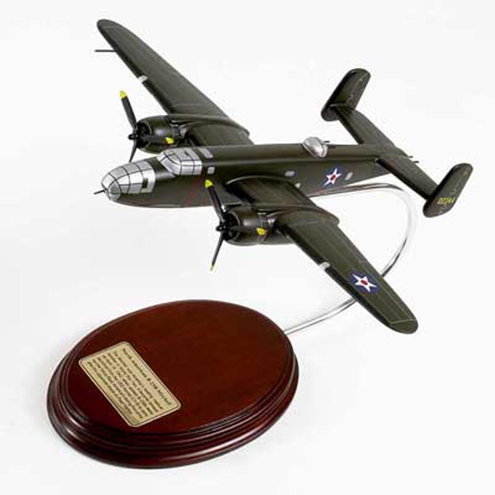 This high quality replica is handcrafted from mahogany and comes with a wooden base. Length is 10.75" and wingspan is 12.36". Scale is 1/65 This collectible B-25B represents the aircraft flown by Jimmy Doolittle on the famous Doolittle Raid on April 18, 1942. This detailed model B-25 shows the bomber that struck America’s first blows against Japan in World War II and offered an valuable morale boost to the nation. Painstakingly built from Philippine mahogany by our skilled craftsmen with a wealth of detail, this 1/65-scale model B-25B makes a great aviation gift for any pilot, enthusiast or history buff. The B-25 Mitchell was one of the most widely produced aircraft of World War II, serving in every theater in a variety of configurations. The twin-engine Mitchell made the first strikes against Japan during the famed Doolittle Raid in 1942; served in Europe, and became deadly ground attack aircraft when fitted with up to 14 forward-firing machine guns. Development of the B-25 began in the 1930s as an outgrowth of North American Aviation’s XB-21 project. The new aircraft, called NA-40 by the company, was evaluated by the Army Air Corps in 1939 and ordered into production as the B-25. The B-25 was an inch under 53 feet long, with a wingspan of 67 feet, 6 inches. Powered by two Wright 2600 Twin Cyclone engines developing 1,850 horsepower each, the B-25 had a maximum speed of 275 mph and a combat radius of 1,350 miles. Armament could include up to 6,000 pounds of bombs; eight 5-inch rockets; a torpedo, and forward firing machine guns or cannon. Versions of the B-25 fitted with up to 14 forward-firing .50-caliber machine guns proved devastating to Japanese shipping, and strafing and “parafrag” attacks proved valuable for attacking airfields. Maj. Paul “Pappy” Gunn developed many of the innovations that made the Mitchell a devastating attack aircraft, pioneering the strafing modifications, as well as skip-bombing techniques against shipping. Mitchells would come in at low-level, guns blazing, as pilots kicked rudder pedals to walk rounds along the waterline of Japanese ships and to suppress anti-aircraft fire. Crews would drop their delay-fused bombs before they roared just above their targets. The bombs would skip along the water, hit the ship and sink before detonating underwater, ripping open the bottoms. Almost 10,000 B-25s were produced, and the tough bombers served with many nations. Following World War II, many B-25s landed in long-term storage while others continued to be used as trainers, recon aircraft or in support roles. The last B-25 in the Air Force was retired in 1960. The most famous use of the B-25 was in 1942, when Lt. Col. Jimmy Doolittle led a force of 16 aircraft from the USS Hornet to attacks on cities in Japan. Select crews trained in Florida on short-field takeoff techniques before embarking on the Hornet in San Francisco on April 1, 1942. The Hornet and its task force met the USS Enterprise days later off Hawaii and the force, Task Force 16, headed for Japan. Doolittle planned to launch his raid 450 miles from the Japanese coast, with the B-25s flying on to bases in China. However, at 7:38 a.m. April 18, 1942, the force was spotted by a Japanese picket boat more than 600 miles from Japan. Doolittle and Hornet commander Marc Mitscher decided to launch the Army planes immediately. Doolittle – in the number one plane - had only 467 feet in which to take off. He launched safely, and the remaining 15 aircraft departed over the next hour. Flying low to avoid radar, Doolittle’s force attacked Tokyo, Yokosuka, Nagoya, Osaka and Kobe. No planes were lost over Japan, but fuel was running low in every ship. A tailwind helped the raiders reach China, although one crew headed for Russia. As night fell, weather worsened and the raiders were forced to bail out or crash land along the coast. Three raiders died in the crash of their aircraft or bailing out; eight were captured by the Japanese, with three eventually executed and one starving to death as a POW. The remaining raiders eventually made it back to Allied-controlled areas, and continued their service, with a number remaining in the China-Burma-India Theater. The crew that landed in Russia was interned before making an escape through Iran in 1943. Doolittle was awarded the Medal of Honor and promoted to brigadier general, and went on to command the Eighth Air Force as a lieutenant general. While the raid did relatively little damage, it was a vital morale boost for a nation that had seen military setback after setback in their days following Pearl Harbor. The raid also strengthened Japanese Admiral Isoroko Yamamoto’s determination to seize Midway Island, which led to a major U.S. victory and marked a turning point in the war in the Pacific. |