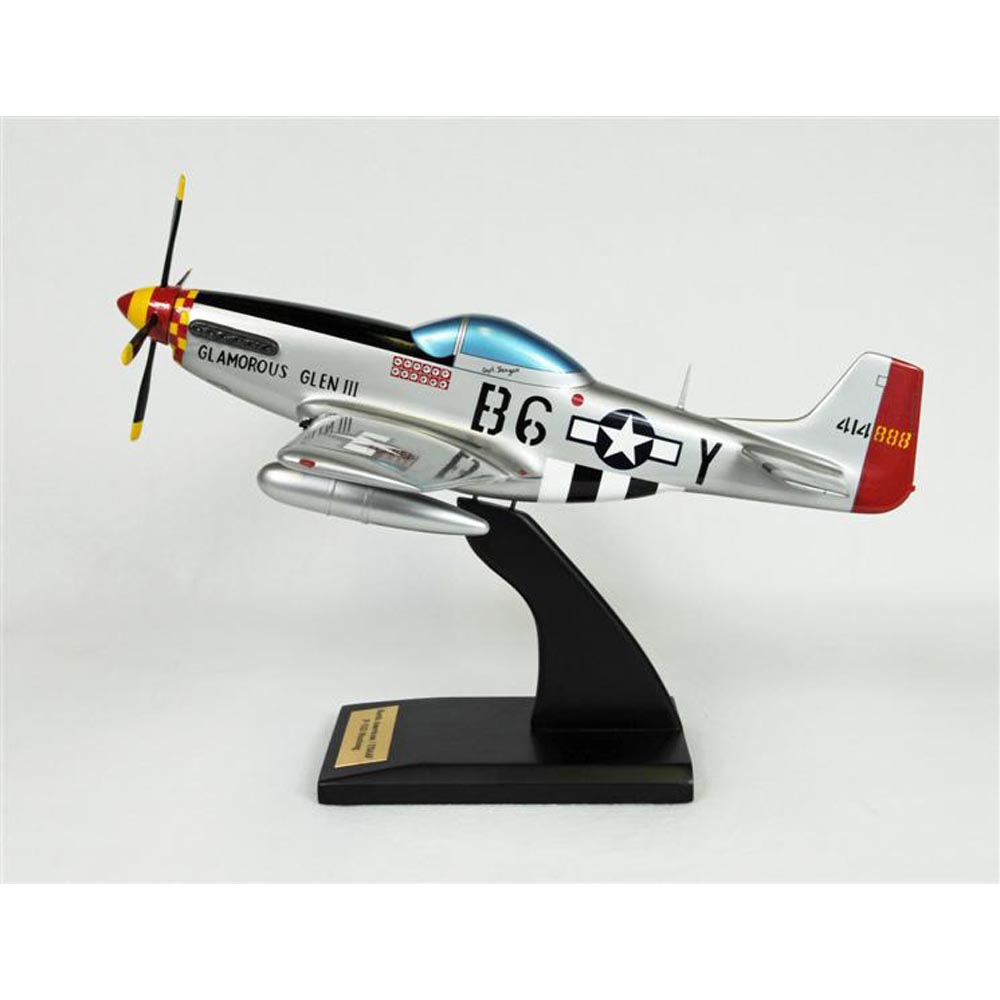 This high quality replica is handcrafted from mahogany and comes with a wooden base. "Glamorous Glenn" design. Length is 14-3/8" and wingspan is 18-1/4". Scale is 1/24. The P-51D Mustang was the most widely produced variant. It was equipped with an Aeroproducts propeller in place of the Hamilton Standard propeller, as well as a larger, differently configured canopy and other minor alterations. The P-51D Mustang has a crew of 1. It has a maximum speed of 437 mph and a range of 1,650 mi. It has armament of 6 0.50 in machine guns, 2 hardpoints and 10 in rockets. More famous as the first person to fly faster than the speed of sound than his wartime achievements, Chuck Yeager became an Ace in Europe flying a P-51. After he was promoted to captain, he added 1 Me-262 and 4 Fw-190s for a total of 11 career victories. |