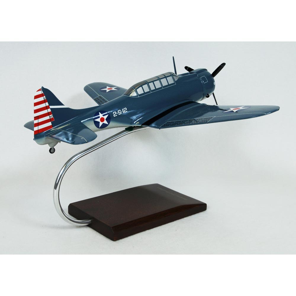 This high quality replica is handcrafted from mahogany and comes with a wooden base. Length is 12-1/2" and wingspan is 15-1/2". Scale is 1/32. The SBD-5 model was the standard aircraft carrier based dive-bomber of the US Navy from mid-1940 until November 1943, when it was replaced by the Curtis SB2C Helldiver. This model of SBD Dauntless was considered obsolete even before the Pacific War started, and was supposed to be retired before Pearl Harbor occurred. Needless to say this did not happen. The SBD went on to be one of the most famous dive bombers in existence (next to the Stuka), and this was mostly due to extreme luck during the Battle of Midway. |