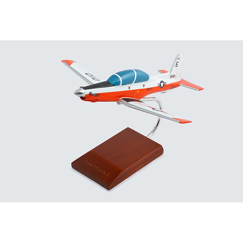 The collectable model T-6A Texan II represents the latest generation of trainers used by the U.S. Air Force and U.S. Navy. A replacement for the venerable T-34, the T6-A Texan II is painstakingly built from Philippine mahogany by our skilled craftsmen with a wealth of detail, this T-6A Texan II makes a great gift for any aviation enthusiast or history buff. Based on the Pilatus PC-9 civilian turboprop, is manufactured by Raytheon Aircraft in Wichita, Kansas. The T-6A Texan II is a single-engine, two-seat primary trainer aircraft, which is designed to train Joint Primary Pilot Training students in basic flying skills common to U.S. Air Force and Navy pilots. The T-6A Texan II began replacing the T-34C Turbo Mentors in Navy service in 2005. Powered by a single, Pratt & Whitney PT6A-68 turboprop engine with a four-blade propeller, it features a stepped-tandem cockpit configuration, with the instructors rear seat raised slightly to improve visibility from the rear cockpit; modern avionics; and improved egress systems. Both T-6A cockpits are covered by a single, side-opening, non-jettisoned canopy. The T-6A provides a high degree of flexibility as a trainer, equally capable of training the beginner pilot or performing training missions well into an advanced curriculum. The T-6A is currently used by the U.S. Air Force, U.S. Navy, the Hellenic Air Force of Greece and the NATO Flying Training in Canada program as a primary trainer and weapons and navigation trainer. |