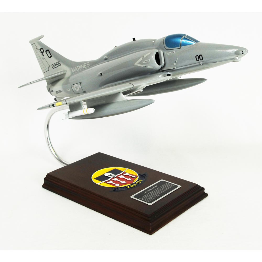 Manufactured by Douglas Aircraft Corporation and originally intended to operate from United States Navy (USN) aircraft carriers, the A-4 Skyhawk was designed by Ed Heinemann in response to the Navys request for a jet-powered attack aircraft that would replace the A-1 Skyraider. Heinemann chose a design that would minimize size, weight and complexity. The result was an aircraft that weighed only half of the Navys specification and had wings so compact that need not be folded for carrier stowage. The petite aircraft soon received the nicknames “Scooter”, “Bantam Bomber”, “Tinker Toy Bomber” and, in reference to its agility, “Heinemanns Hot-Rod”. The first prototype flew on June 22, 1954, and deliveries to the USN and US Marine Corps (USMC) began in late 1965. Production of the Skyhawk was put to a halt in 1979, and by then, a total of 2,960 aircraft had been built. The design of the Skyhawk is not uncommon among post-World War II planes. It had a delta wing, a tricycle undercarriage, a single turbojet engine in the rear fuselage and a cruciform tail. Armament included cannons and a large variety of bombs, rockets and missiles. The A-4 was the pioneer of the “buddy” self air-to-air refueling concept. This allows aircraft to supply fuel to others of the same type without the need for a dedicated tanker, and was particularly handy for small air arms or when operating in remote locations. In case of any hydraulic failure, the Skyhawk was also capable of emergency landing on drop tanks that were almost always carried by the aircraft. |