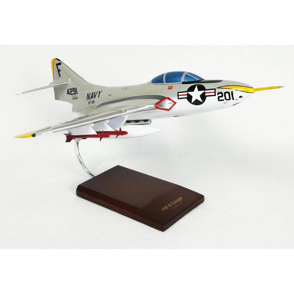 The F9F-8 Cougar, manufactured by Grumman, was designed to serve as an aircraft carrier-based fighter aircraft for the United States Navy. Based on the earlier Grumman F9F Panther, the Cougar replaced the Panthers straight wing with a more modern swept wing. The Navy considered the Cougar a mere new version of the Panther (despite adopting a different official name) and thus Cougars started off as F9F-6 and upwards. On January 18, 1954, the F9F-8 had its first flight. A total of 601 F9F-8s were delivered to the Navy between April 1954 and March 1957. During the course of production, a fixed in-flight refueling probe was added to the nose. Most F9F-8s were fitted with Ultra High Frequency (UHF) homing antenna in a fairing underneath the nose. Late production F9F-8s were fitted with the capability of carrying two Sidewinder infrared-homing air-to-air missiles underneath each wing. This feature was retrofitted to many earlier F9F-8s. In 1962, the F9F-8 was redesignated F-9J under the new Defense Department Tri-Service designation scheme. The F9F-8B fighter-bomber became AF-9J. Later, when used as advanced trainers, some of these aircraft became TAF-9J. |