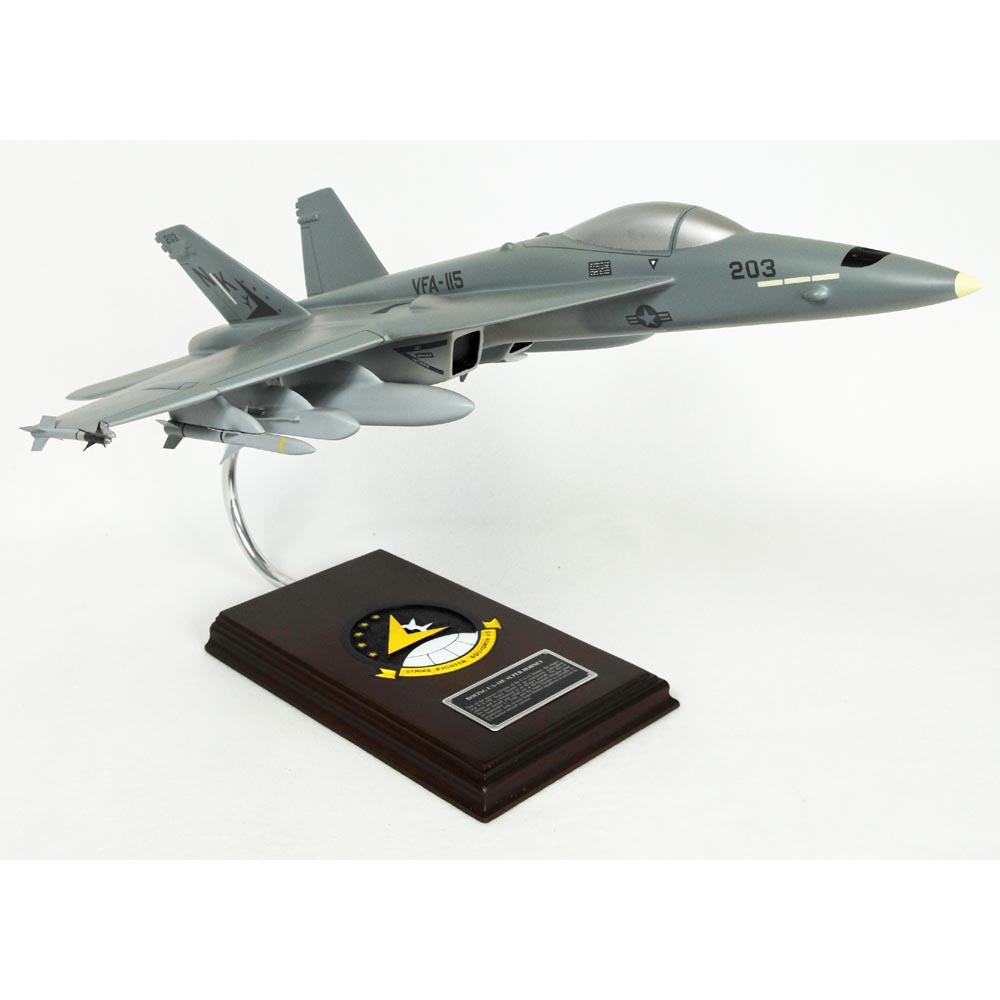 This high quality replica is crafted from mahogany wood and comes with a wooden base. Length is 20" and wingspan is 14". Scale is 1/38. Manufactured by Boeing Integrated Defense Systems, the F-18E Super Hornet is a distinct, evolutionary upgrade to the F-18 designed to serve a complementary role with Hornets in the U.S. Navy. The Super Hornet is equipped with all the capability, flexibility and performance necessary to modernize the air or naval aviation forces of any country. The Super Hornet’s suite of integrated and networked systems provides enhanced interoperability and support for ground forces as well as the overall force commander. On July 24, 2002, the first operational cruise of Super Hornet, F 18E, was with VFA-115 onboard the USS Abraham Lincoln (CVN 72). The Super Hornet saw initial combat action on Nov. 6, 2002, when they participated in a strike on hostile targets in the ""no-fly"" zone in Iraq. Built by the industry team of Boeing, Northrop Grumman, GE Aircraft Engines, Raytheon and more than 1,800 suppliers nationwide, the Super Hornet provides the warfighter with today’s newest advances in multi-mission capability and growth for decades to come in mission roles and technology. |