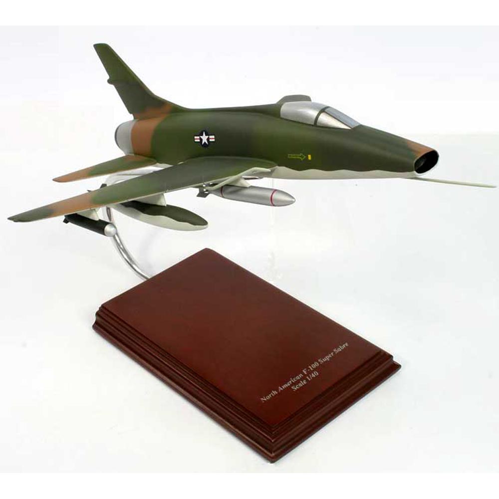 The North American F-100 Super Sabre was a supersonic jet fighter aircraft that served with the United States Air Force (USAF) from 1954 to 1971 and with the Air National Guard (ANG) until 1979. The first of the Century Series collection of USAF jet fighters, it was the first USAF fighter capable of supersonic speed in level flight. The F-100 was originally designed by North American Aviation as a higher performance follow-on to the F-86 Sabre air superiority fighter. It was named Sabre 45 because of its 45° wing sweep. Painstakingly built from Philippine mahogany by our skilled craftsmen with a wealth of detail, this 1/40-scale model makes a great pilot gift, or a present for any aviation enthusiast or history buff. |