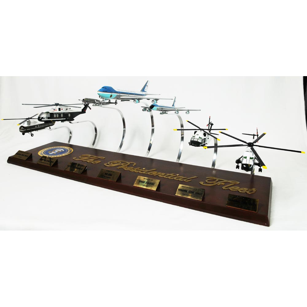 This Collection features the seven of the aircraft and helicopters used to support the President of the United States. This Collection features the seven of the aircraft and helicopters used to support the President of the United States. The collection includes (from left to right): Marine One VH-34, Marine One VH3, VC-121 Columbine III, VC-25A, SAM 26000, Marine One VH60, and Marine One VH-71. This each miniature model of the Presidential aircrafts and helicopters is an authentic replica made from the finest grade of select kiln dried mahogany wood. The model is hand-carved; from the aircraft fuselage, to the sanding of the airplane’s contours. Every part is assembled precisely into place. Each model passes through various stages; from priming and sanding before it is hand-painted to duplicate the actual colors of the original historical aircraft. Every detail of the actual airplane is also copied -- from insignias to squadron badges, nose-art, emblems and serial numbers. Finally, multiple coats of clear lacquer are applied to protect the artwork and provide an overall glossy finish. Mounted on a beautiful mahogany base all seven aircraft and helicopters are precisely hand finished to exact detail. Complete with the Presidential logo and brass plaques indicating the aircraft type. Now you can have the Presidential Collection right before your very eyes at the most reasonable price. |