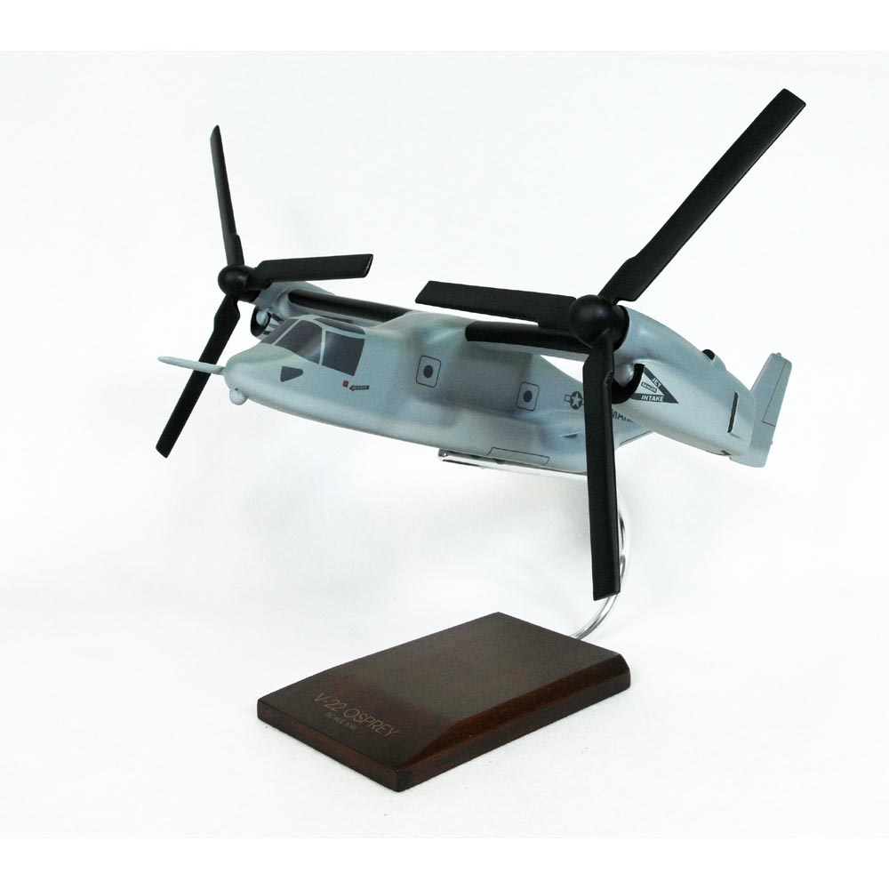 This high quality 1:96 scale replica of the USMC V-22 Osprey is crafted from resin and comes with a wooden base. Length is 7-1/4" and wingspan is 6-1/2". |