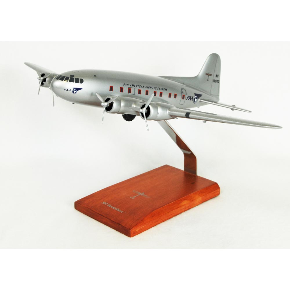 The Boeing Model 307 Stratoliner was the first fully pressurized airliner to enter service anywhere in the world. Capable of flying 20,000 feet higher than the 5,000 to 10,000-foot altitude unpressurized airplanes at that time, it was said that it could “fly above the weather�. The Model 307 had a capacity for five crew members and 33 passengers, and had a nearly 12-foot wide cabin for overnight berths. It was the first plane to include a flight engineer as a crew member. Only ten Stratoliners were produced. Three were built for Pan Am, five served with TWA, and a ninth was supplied to multi-millionaire Howard Hughes. The prototype crashed during a test flight. By 1940, the Model 307 was flying routes between Los Angeles and New York, as well as to locations in Latin America. Howard Hughes purchased a model for his personal use, and had it transformed into a luxurious “flying penthouse�. This same plane was later sold to oil tycoon Glenn McCarthy in 1949. The only surviving Stratoliner, operated by Pan Am, is preserved in flying condition at the Smithsonian Museums Steven F. Udvar-Hazy Center. On March 29, 2002, this particular aircraft was subject to a dramatic crash in which it ditched into Elliott Bay in Seattle, Washington, on what was to be its last flight before heading to the Smithsonian. Despite the incident, it has again been restored and is now on display. |