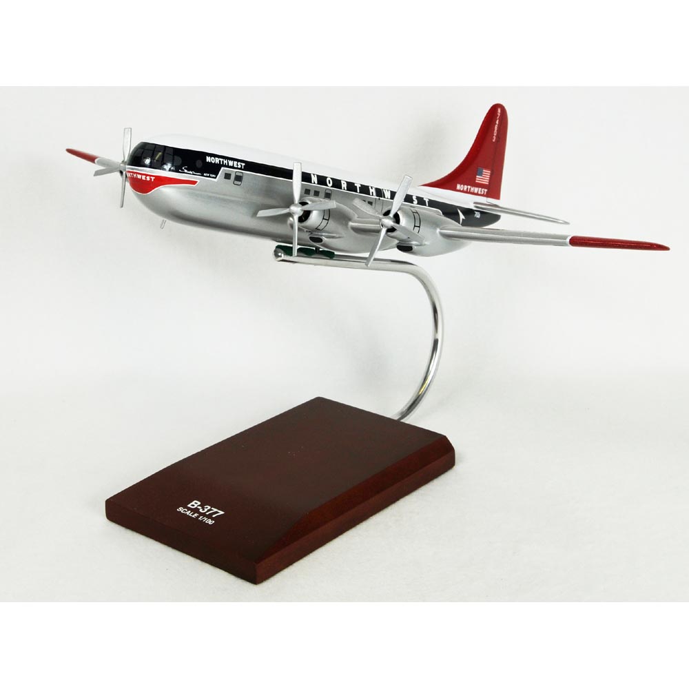 The Boeing 377 Stratocruiser was the civilian version of the C-97 Stratofreighter, which in turn was derived from the B-50 Superfortress. It first flew on July 8, 1947. Despite serious design flaws and a marginal service record, the Stratocruiser was considered one of the greatest post-war propeller airliners. In the 1960s, several Stratocruisers were modified by Aero Spacelines to make oversized transports and were dubbed as ""Guppys"". The Boeing 377 has a seating capacity of up to 100 passengers on main deck and an additional 14 in lower deck lounge. The typical seating for 63 or 84 passengers. It incorporates 4 Pratt & Whitney R-4360-B6 Wasp Major 28-cylinder radial engines four-bladed propellers. It has a maximum speed of 375 mph and a range of 3,650 nm. The primary users and operators of the Boeing 377 are the Pan Am and the BOAC. Extremely complex and expensive, only 56 were built. It continued in mainline service until 1960, when it had been made obsolete by the coming of the 707 and other first generation jetliners. |
