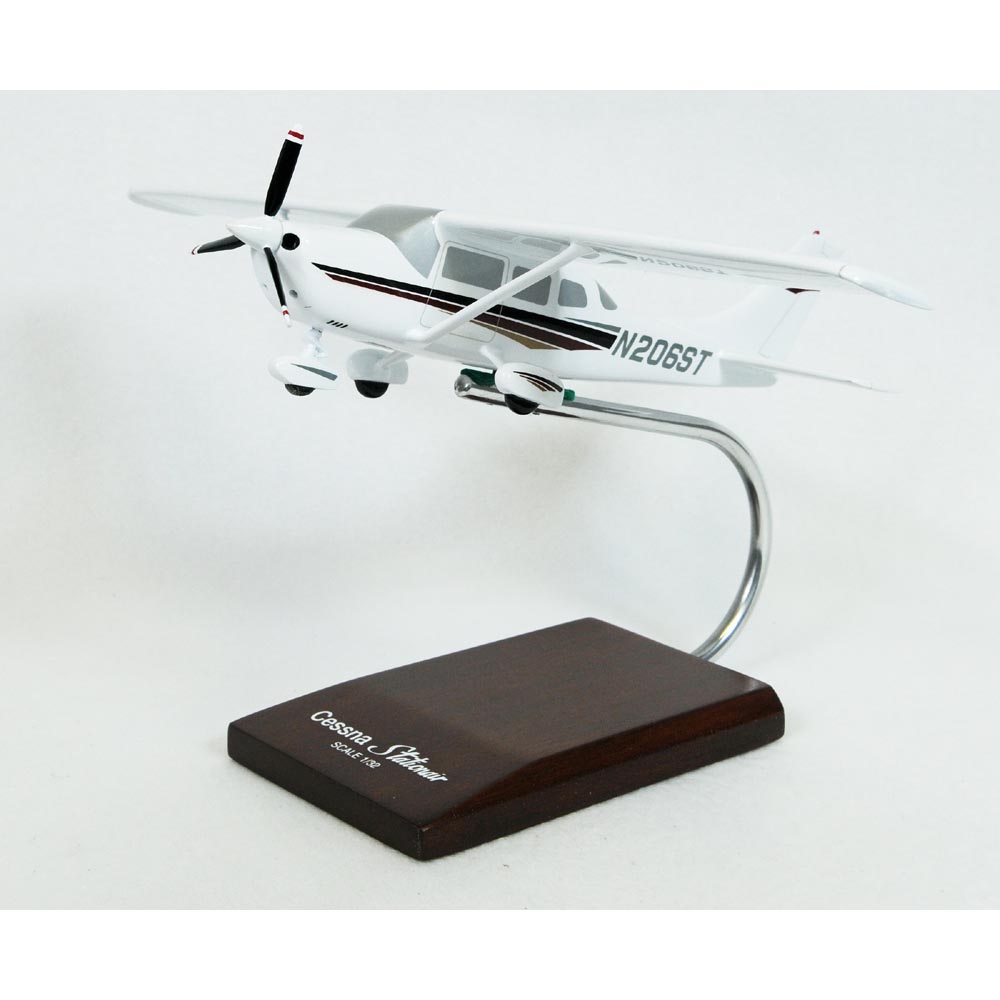 This high quality replica is crafted from resin and comes with a wooden base. Length is 10-1/2" and wingspan is 13-1/2". Scale is 1/32. The Cessna 206 Stationair is a six-seat single-engine general aviation aircraft with fixed landing gear used in commercial air service and for personal use. It is also used for aerial photography, skydiving and other utility purposes. Originally developed from the popular retractable-gear Cessna 210, the 206 has a powerful engine, rugged construction and a large cabin that has made it a popular bush plane. Cessna describes it as “the sport utility vehicle of the air”. It is supported by an active aircraft type club, the Cessna Pilots Association. The 206 was introduced in 1964 and built until 1986, when Cessna halted production of its single-engine product. It was reintroduced in 1998 and remains in production in 2007. There are many sub-variants, and the total number produced between 1964 and 2004 was 6,581 aircraft. The original 1964 model was the U206. The “U” designation indicated “utility” and this aircraft was equipped with a pilot side door and large clamshell rear door serving the back two rows of seats, allowing easy loading of oversized cargo. From 1964 to 1969, it was known as the “Super Wagon”. From 1970 it was named the “Stationair”, a contraction of “Station Wagon of the Air”. Production of the U206 was halted in 1986 was halted when Cessna stopped manufacturing all piston engine aircraft. A total of 5,208 U206s had been manufactured. |