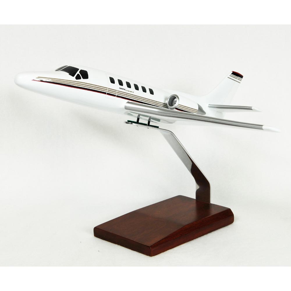 The Citation S/II is a light corporate jet manufactured by Cessna. Upon the arrival of the Citation S/II, major improvements were made to its design. Citation S/II first flew on February 14, 1984 and certification was granted including an exemption for single pilot operation. The improvements were mainly aerodynamic, including a new wing design using supercritical technology developed for the Citation III and it incorporates two 11.1 kN Pratt & Whitney Canada JT15D4B turbofans. The Citation S/II has a flightcrew of two. The Citation S/II has a maximum cruising speed of 743 km/h. In 1984, the Citation S/II initially replaced the Citation II. |