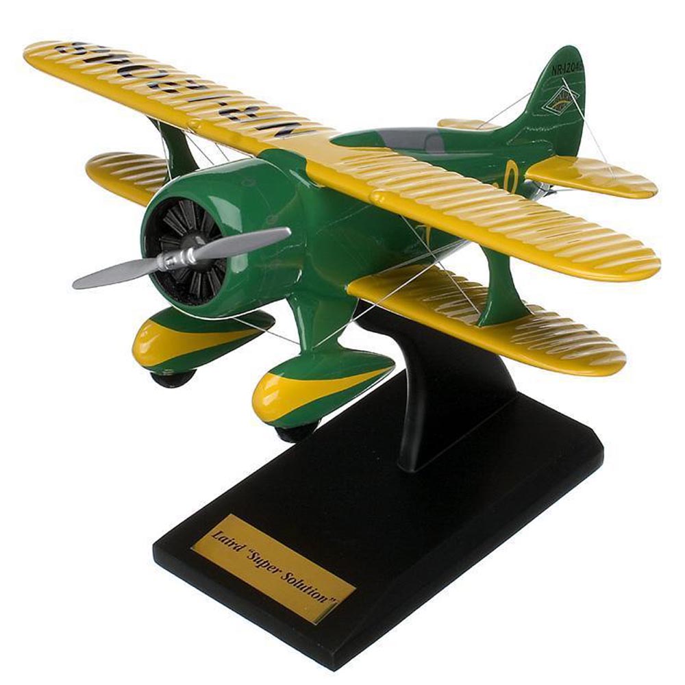 The Laird Super Solution was a racing biplane designed and built for the Cleveland Speed Foundation by E. M. “Mattie” Laird. It had a large radial engine and an extremely faired windshield, and was similar in appearance to the Gee Bee. The Super Solution was an advanced design for the time because of the relatively clean aerodynamic construction and tight engine cowling. Work on the LC-DW Super Solution began on July 8, 1931. The aircraft was test flown on August 22 by Mattie Laird at Fishborn Field in Chicago, near the Laird Factory. The Super Solution was fitted with complete instrumentation for cross country and blind flying. It featured a new fresh air system that consisted of two vents placed at the leading edge of the top wing, well outside the range of engine exhaust, which channeled fresh air into the cockpit. Laird provided two different engines for the Super Solution. For the cross-country Bendix Race, where steady power at high altitudes would be the key, the airplane would use a direct-drive engine. For the closed-course Thompson Race, a 3:2 geared-drive engine would give the best flat-out power. Jimmy Doolittle and the Super Solution won the Bendix Race with an elapsed time of 9 hours, 10 minutes, and 21 seconds. During the Thompson Race, however, the engine encountered problems and Doolittle had to land the Super Solution after the seventh lap to avoid a complete engine failure. |