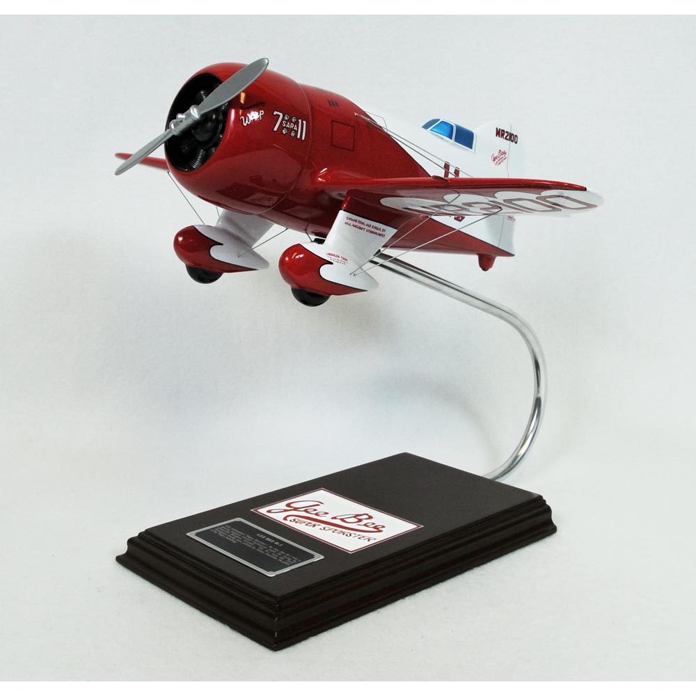 The Gee Bee R-1 was designed and built for the 1932 Races. The Gee Bee R-1 is a fairly constructed aircraft. Only the best materials were used and the workmanship was incredible. The wings were covered with mahogany plywood and covered with ""balloon-fabric"" for added strength. The most unusual feature was its pilot position just ahead of the vertical fin. The R-1 and R-2 were considerably larger than the previous model Z. The R-1 and R-2 are very similar except that the R-1 has a larger and more powerful Pratt & Whitney R1340 ""Wasp"" engine and it is specifically made for the Thompson Trophy. The R-2 was built for the Bendix Trophy races. The biggest difference between the two aircraft was that the R-2 had two fuel tanks totaling a 302 gallons versus a single 160 gallon tank in the R-1. The R-2 has a 20-gallon oil tank and the R-2 also has streamlined running lights in the wings and on the tail for night flights. The R-1 has a speed of 294.38 miles per hour and a cruising range of 925 miles. |