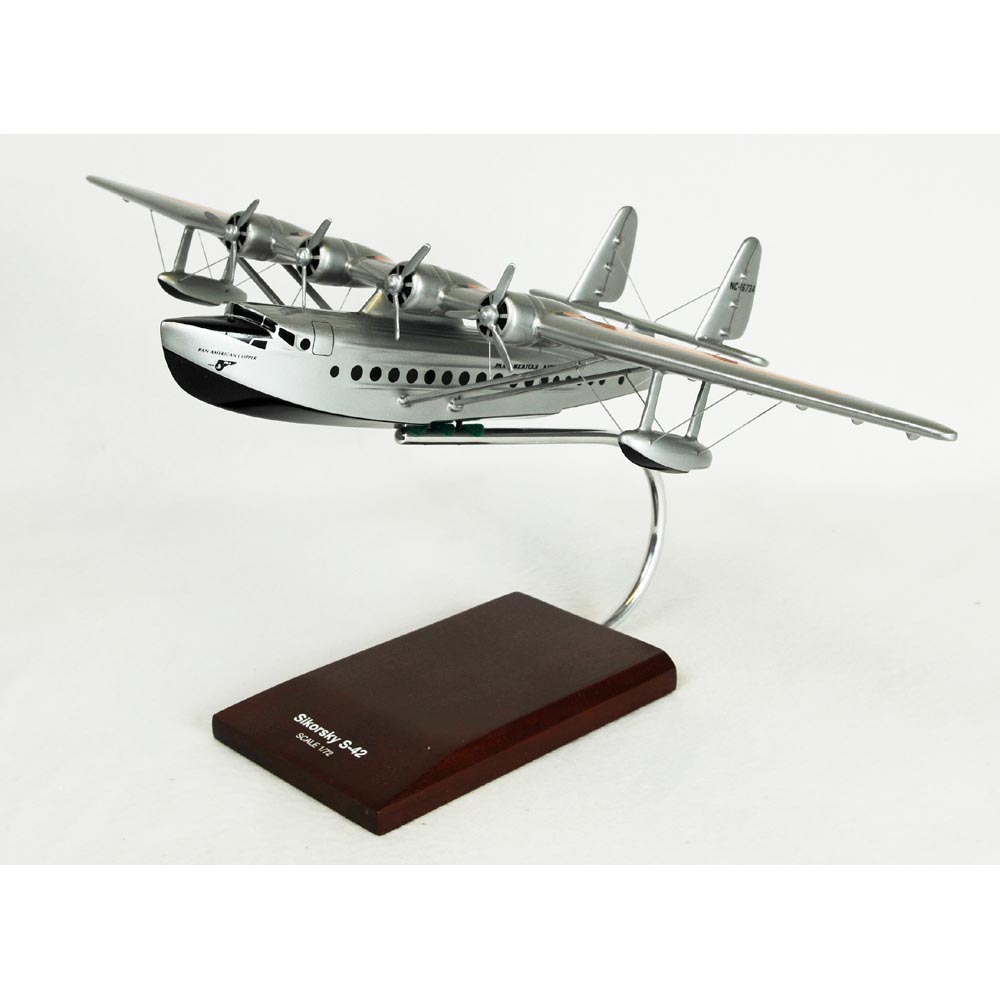 The American Sikorsky S-42 is regarded as the first truly American seaplane and was based on the earlier Sikorsky S-40. It was described as the ""most beautiful aircraft of its time."" Igor Sikorsky and Charles Lindbergh, both consultants of Pan American Airways consultant at that time, laid out plans for a new and larger flying boat. During the inaugural flight of the S-40 on November 19, 1931, the two visionaries began preliminary sketches on the back of a menu in the S-40s lounge. The Pan American President, Juan Trippe, had a similar vision of an aircraft that could span oceans. The new design provided for an increased lifting capacity, permitting to carry fuel for a 2,500 mile nonstop flight against a 30 mile-an-hour, at a cruising speed far in excess of the average operating speed of any flying boat at that time. The S-42s maiden flight was on March 30, 1934 and was also known as the Flying Clipper and the Pan Am Clipper. On October 10, 1931, the first S-40 was delivered to Pan Am and was flown to the Anacostia Naval Air Station at Washington D.C., christened by Mrs. Herbert Hoover. Theres a total of ten S-42s built and manufactured by the Vought-Sikorsky Aircraft Division of the United Aircraft Corporation in Stratford, Connecticut. S-42 has crew capacity for four. It has a maximum speed of 188 mph and a range of 1,930 miles. All Sikorsky S-42s were either scrapped or destroyed in accidents. |