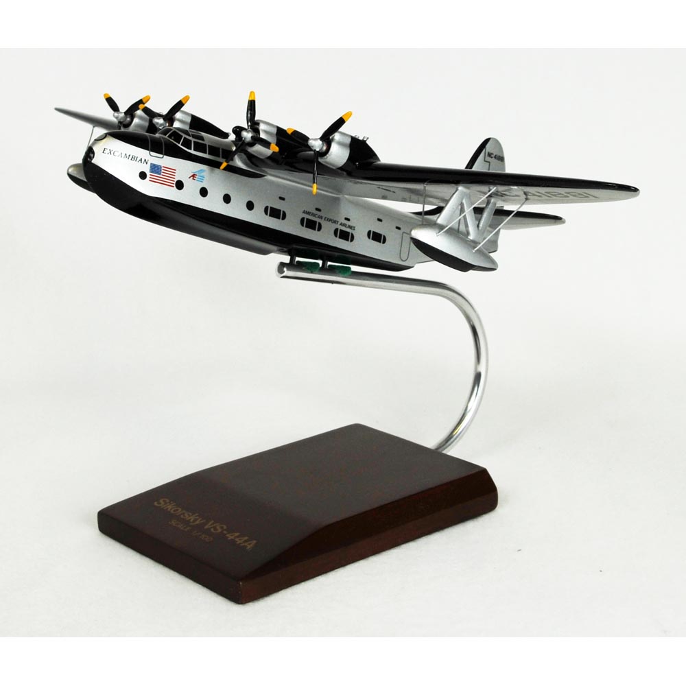 | The Sikorsky VS-44 was a large four-engined flying boat built to compete in the transatlantic air travel trade carrying 40 or more passengers across the Atlantic Ocean. Sikorsky’s standard of luxury boasted full-length beds, dressing rooms, a full galley, a snack bar, a lounge, and fully controlled ventilation. American Export Airlines (AEA) ordered for three VS-44s. They were named Excalibur, Excambian, and Exeter. World War II began and put civilian transatlantic air service on hold. Now under a Navy contract and with the Navy designation JR2S-1, AEAs three VS-44s continued flying between New York, New York and Foynes, Ireland, carrying passengers, freight and war materiel. Excalibur, the first VS-44, crashed on takeoff in 1942. After the war, the two remaining VS-44s continued to fly for the airline, which had been renamed American Overseas Airlines (AOA). AOA sold Excambian in 1949 to Tampico Airlines. In 1946 Exeter was sold to TACI of Montevideo, Uruguay. It crashed on August 15, 1947 while landing in River Plate off Montevideo. In 1976, Excambian was donated to the Naval Aviation Museum at Pensacola, Florida and eventually put on permanent loan to the New England Air Museum (NEAM) in Connecticut. NEAM restored Excambian to its WWII livery with volunteer help from some of the former Sikorsky workers who had built the original VS-44. |