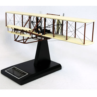 This high quality replica is handcrafted from mahogany and comes with a wooden base. Length is 8" and wingspan is 15 3/8". Scale is 1/32. The Wright Flyer (often retrospectively referred to as Flyer I and occasionally Kitty Hawk) was the first powered aircraft designed and built by the Wright brothers. It was the first successful powered, piloted, controlled heavier-than-air aircraft. The Wright Flyer was a canard biplane configuration. The Wright Flyer was based on the Wrights' experience testing gliders at Kitty Hawk between 1900 and 1902. The Wrights built the aircraft in 1903 using 'giant spruce' wood as their construction material. Since they could find no suitable automobile engine for the task, they commissioned their employee Charlie Taylor to build a new design from scratch. A sprocket chain drive, borrowing from bicycle technology, powered the twin propellers, which were also made by hand. In 1904, the Wrights continued refining their designs and piloting techniques in order to obtain fully controlled flight. Major progress toward this goal was achieved in 1904 and even more decisively with the modifications during the 1905 program, which resulted in a 39-minute, 24 mile nonstop circling flight by Wilbur on October 5. While the 1903 Flyer was clearly a historically important test vehicle, its near-mythical status in American imagination has obscured its place as part of a continuing development program that eventually led to the Wrights' mastery of controlled flight in 1905. In 1910 the Wrights first made attempts to exhibit the Flyer in the Smithsonian Institution but talks fell through with the ensuing lawsuits against Glenn Curtiss and the Flyer may have been needed as repeated evidence in court cases. In 1916, Orville brought the Flyer out of storage and prepared it for display at the Massachusetts Institute of Technology. (Wilbur had died in 1912.) He replaced parts of the covering, the props, and the engine's crankcase, crankshaft, and flywheel. The crankcase, crankshaft and flywheel had been sent to the Aero Club of America for an exhibit in 1906 and were never returned to the Wrights. A number of individuals and groups have attempted to build reproductions of the Wright Flyer for demonstration or scientific purposes. |
