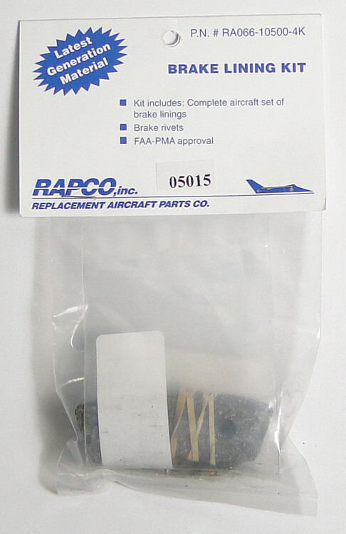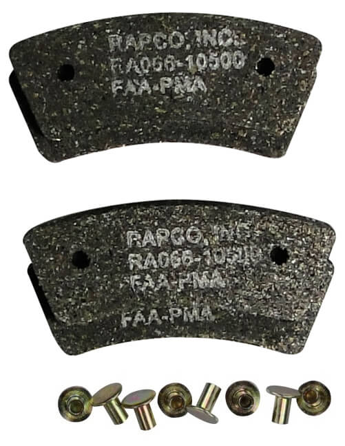 | All Rapco Brake Lining kits come complete with correct number of brake linings and rivets needed for each aircraft. As a RAPCO factory authorized distributor, we offer these FAA-PMA approved brake lining replacements for Cleveland and McCauley brakes as an economical alternative to Cleveland factory linings. All are substantially discounted, with even further savings on quantity orders.