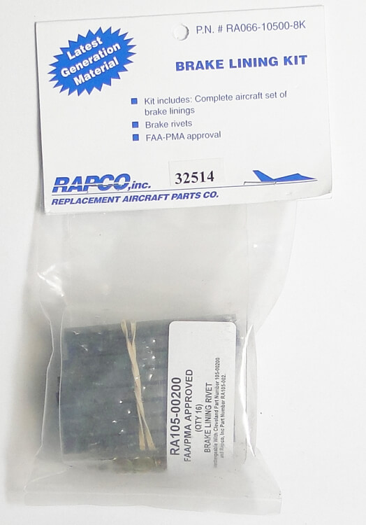 | All Rapco Brake Lining kits come complete with correct number of brake linings and rivets needed for each aircraft. As a RAPCO factory authorized distributor, we offer these FAA-PMA approved brake lining replacements for Cleveland and McCauley brakes as an economical alternative to Cleveland factory linings. All are substantially discounted, with even further savings on quantity orders.