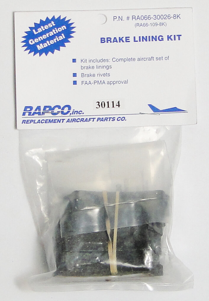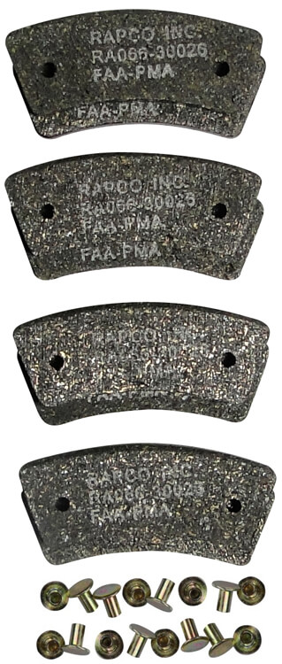 | All Rapco Brake Lining kits come complete with correct number of brake linings and rivets needed for each aircraft. As a RAPCO factory authorized distributor, we offer these FAA-PMA approved brake lining replacements for Cleveland and McCauley brakes as an economical alternative to Cleveland factory linings. All are substantially discounted, with even further savings on quantity orders.