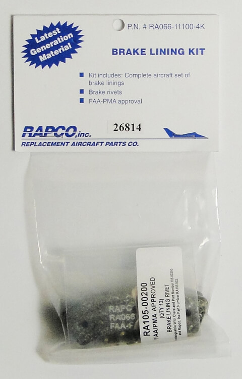 | All Rapco Brake Lining kits come complete with correct number of brake linings and rivets needed for each aircraft. As a RAPCO factory authorized distributor, we offer these FAA-PMA approved brake lining replacements for Cleveland and McCauley brakes as an economical alternative to Cleveland factory linings. All are substantially discounted, with even further savings on quantity orders.