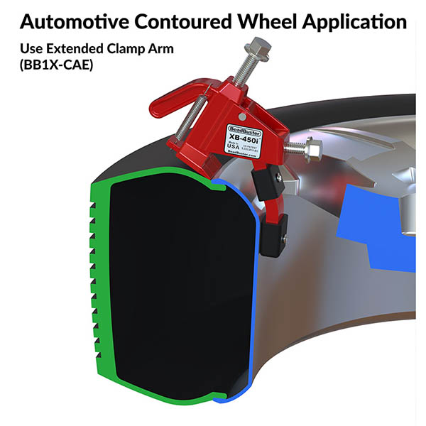 AUTOMOTIVE CONTOURED RIMS: Certain cast aluminum and alloy passenger vehicle rims have a profile that prevents the tool from clamping properly (see illustration). For Automotive wheels with curved/angled surfaces, the accessory Extended Clamp Arm (BB1X-CAE) is needed for proper clamping with those problematic wheels.