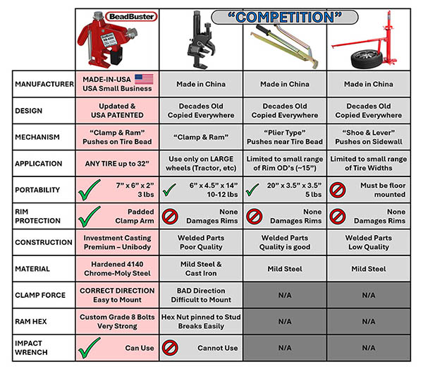 The BeadBuster XB-450i is a 2024 updated design of our original small frame bead breaker (the XB-450 – 1st released in October 2012). It is also a replacement of the other small frame tools (XB-451, 452, 454 PRO & 455). The new design updates include Premium Investment Cast construction from hardened 4140 Chrome-Moly Steel, custom Grade-8 Bolts with crowned tips, and double female ram thread length (1″). These improvements address weld and thread stripping failures that some customers experienced with the legacy design. The removable clamp arm can be swapped with other accessory clamp arms for specialty applications.