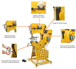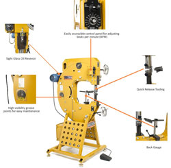| The MH-19 power hammer is a 220 volt single phase machine has the ability to transform itself from a rigid style like a Pullmax® style machine, to a spring slapping style like a Yoder® style machine, or even a very heavy duty English wheel. When operating in the rigid mode, there is no "give" between the die heads. Used for short stroke shaping, flanging. Tooling designs and profiles are endless, but some of the options are mechanical shrinking, stretching dies, flanging dies, and louvers. The spring setup with "Throw the die" causing a dead blow hammering effect. When in this mode the total amount of pressure applied when the dies hit the metal is increase exponentially. This mode would be used for aggressive shrinking and planishing, many different tooling profiles can be used. |