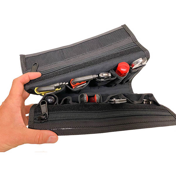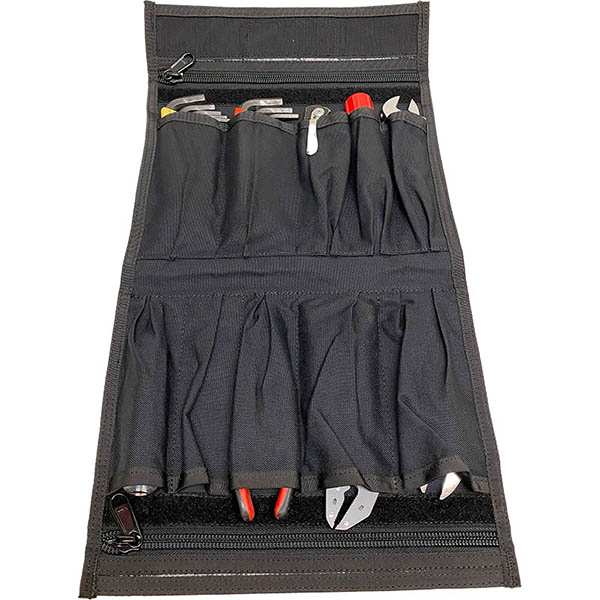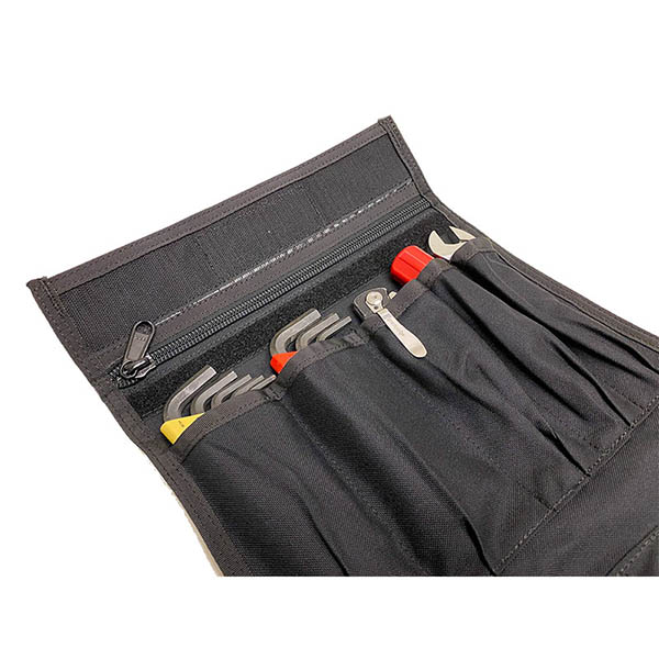 | An all new tool pouch to hold a wide variety of tools in a small package. It has several slots as well as two zippered pockets and exterior molle made from robust elastic for small tools. |