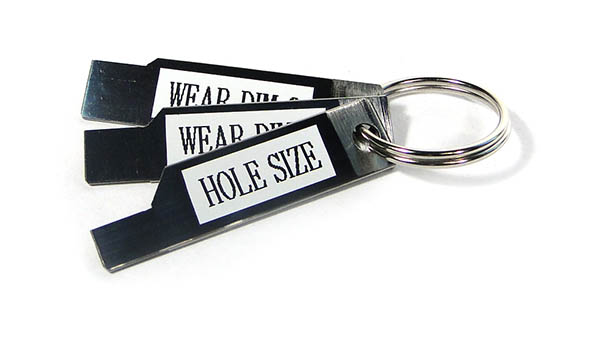| Allows for quick limit checking of seat rail hole and wear dimensions. Gage elements are made from heat treated blue tempered steel. Each element is marked to correspond to the limits set forth in the relevant ad. The three gage elements are linked together on a universal spiral key ring |