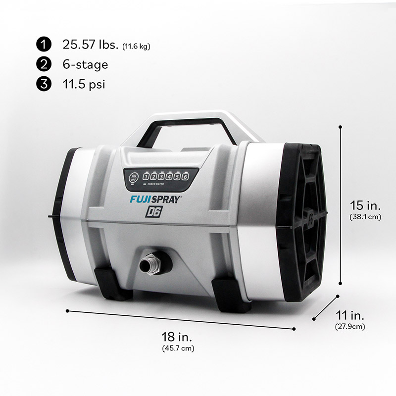 Fuji Spray®’s D6 sets a new benchmark in the spray finishing industry, offering a powerful 6-stage motor rated at 11.5 PSI. Engineered for efficient and cooler operation, the D6 is designed to prolong motor life and maximize return on investment. With 6 pre-set pressure settings, users gain precise control over spray output, ensuring professional-grade results with minimal overspray and waste. The D6 system consistently provides warm, dry air, atomizing even the highest viscosity coatings with virtually no thinning required. This results in stunning finishes and even coverage every time. Built with a rugged design, the D6 ensures unmatched longevity, whether used in the workshop or at the job site. |