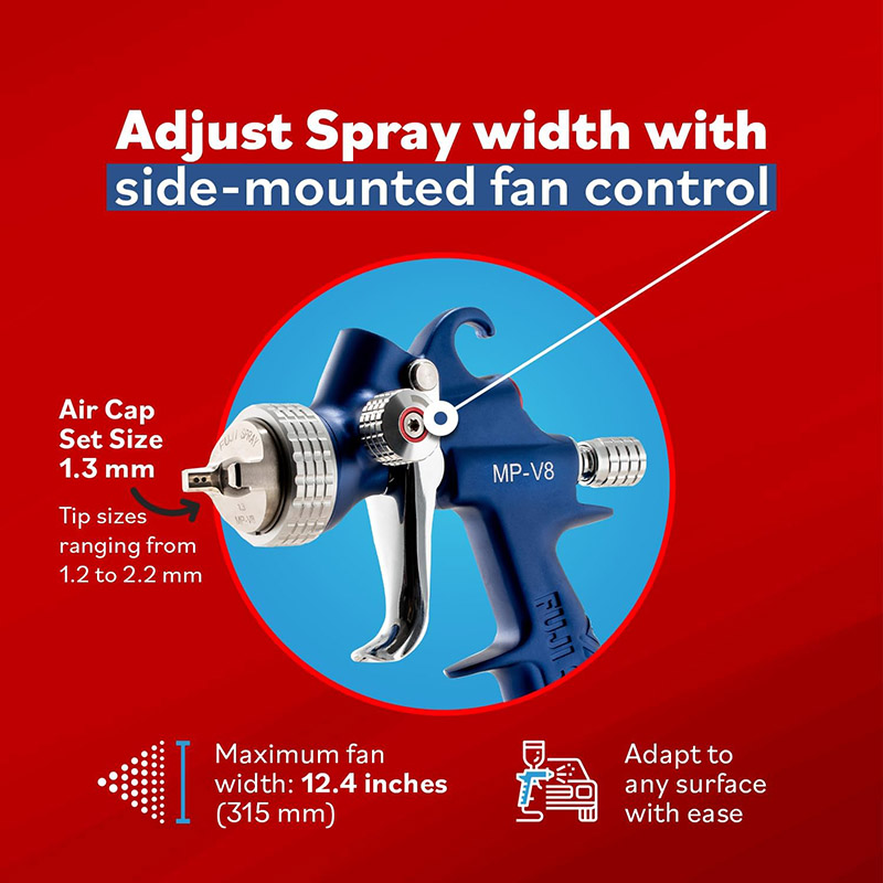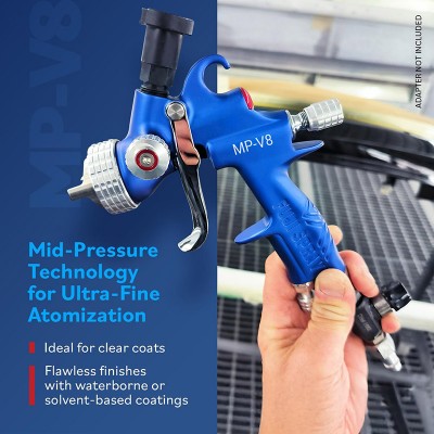 | Designed with Fuji Sprayฎs Mid-Pressure technology, the MP-V8 is the superior choice for professional clear coat application. The MP-V8 features a side-mounted fan pattern control allowing you to precisely set your fan width to match your project size. Suitable for high production facilities, the MP-V8 features a forged aluminum spray gun body with anodized fluid passages for use with waterborne or solvent-based coatings. |