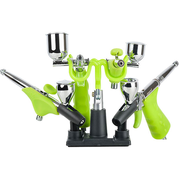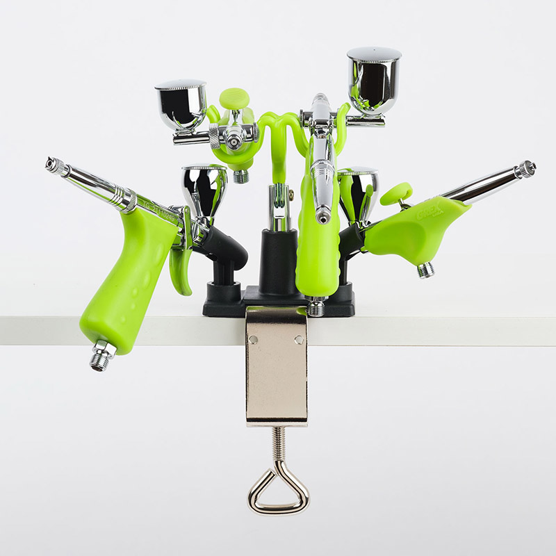 | Adjustable to attach on table and bench tops. Holds up to 4 airbrushes with two rotatable bottom holders and two attached top holders that can pivot 180 deg./rotate 360 deg. |