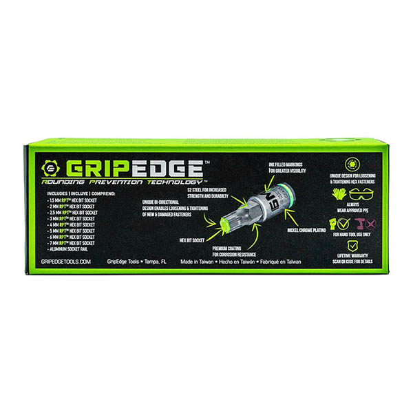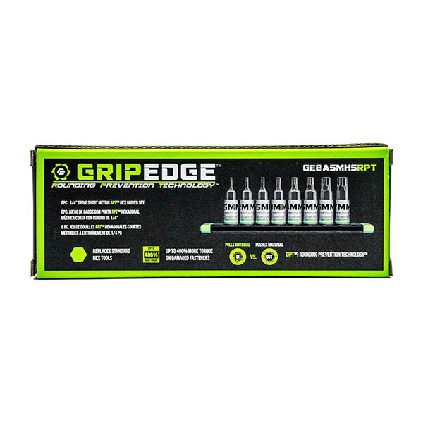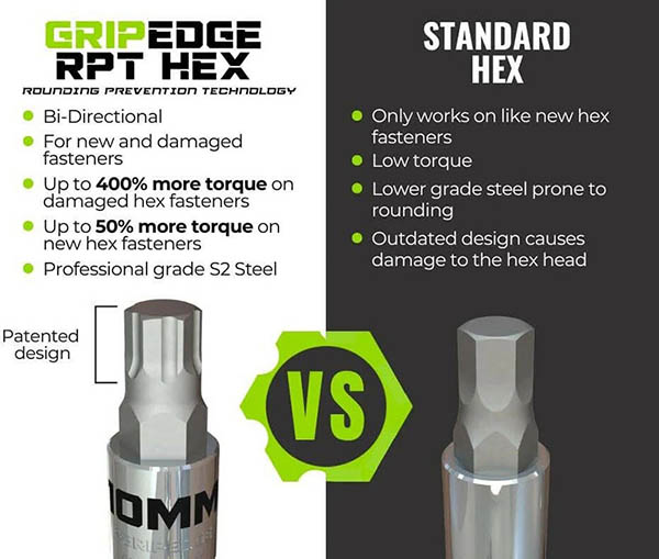 GRIPEDGE RPT (Rounding Prevention Technology) bits are designed to completely replace your traditional drive tools. With RPT bits, you can get up to 50% more torque on new/ good fasteners and up to 400% more torque on stripped/damaged fasteners vs traditional bits. In an emergency situation where you don't have a suitable replacement, RPT gives you the ability to reuse a damaged fastener and tighten it back down. Each bit is made from premium S2 steel for strength and durability, has laser-etched size markings, and is coated with zinc phosphate for corrosion resistance. |