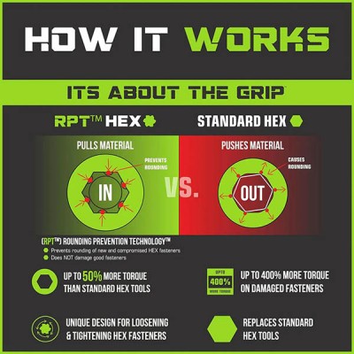 | GRIPEDGE Rounding Prevention Technology (R.P.T.) Hex bit sockets are engineered to outperform traditional hex tools. R.P.T. prevents the rounding of good fasteners and can also remove severely damaged fasteners. Featuring a distinct, patented, bi-directional design, it offers up to 50% more preventative torque on good fasteners than traditional tools and delivers up to 400% more torque on damaged fasteners. Damaged fasteners can be reused temporarily if a suitable replacement isn't available. Each bit is precisely crafted from S2 steel for increased strength and durability and is coated to enhance corrosion resistance. Additionally, all sockets feature large, easy-to-read, roll-stamped, and ink-filled size markings, while nickel chrome plating offers extra protection against corrosion. |
