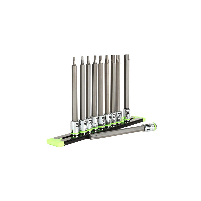 | Introducing the GRIPEDGE 10-PC 1/4" Drive Long SAE Hex Driver Set with R.P.T. (Rounding Prevention Technology). Designed to replace standard tools, R.P.T. Technology offers up to 50% more torque on good fasteners and up to 400% more on damaged ones. Precision machined from S2 steel, these hex bit sockets are corrosion-resistant and feature 4” lengths for better access to hard-to-reach areas. The Set includes sizes from 5/64 to 9/32", perfect for most automotive and industrial applications, and comes on a premium aluminum socket rail. |