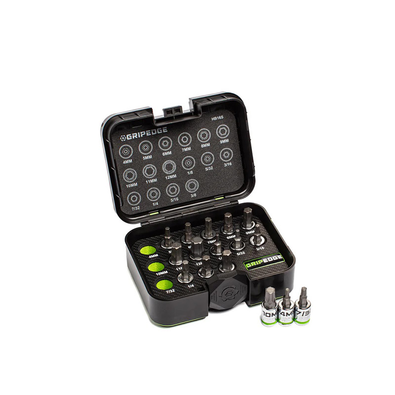 | Introducing the GRIPEDGE 16-PC 3/8" Drive SAE and Metric Hex Driver Set with Rounding Prevention Technology (R.P.T.). These precision-machined S2 steel bits are designed to deliver up to 50% more torque on good fasteners and up to 400% more on damaged ones. The patented bi-directional geometry prevents rounding, ensuring reliable performance. The set includes sizes from 4 to 12 MM and 1/8 to 3/8”, perfect for automotive and industrial applications. Each socket features clear-size markings and nickel chrome plating for corrosion resistance, all housed in a premium case with a removable foam insert. |