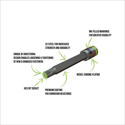 GRIPEDGE RPT (Rounding Prevention Technology) bits are designed to completely replace your traditional drive tools. With RPT bits, you can get up to 50% more torque on new/ good fasteners and up to 400% more torque on stripped/damaged fasteners vs traditional bits. In an emergency situation where you don't have a suitable replacement, RPT gives you the ability to reuse a damaged fastener and tighten it back down. Each bit is made from premium S2 steel for strength and durability, has oversized roll stamped ink-filled size markings, and is coated with zinc phosphate for corrosion resistance. |