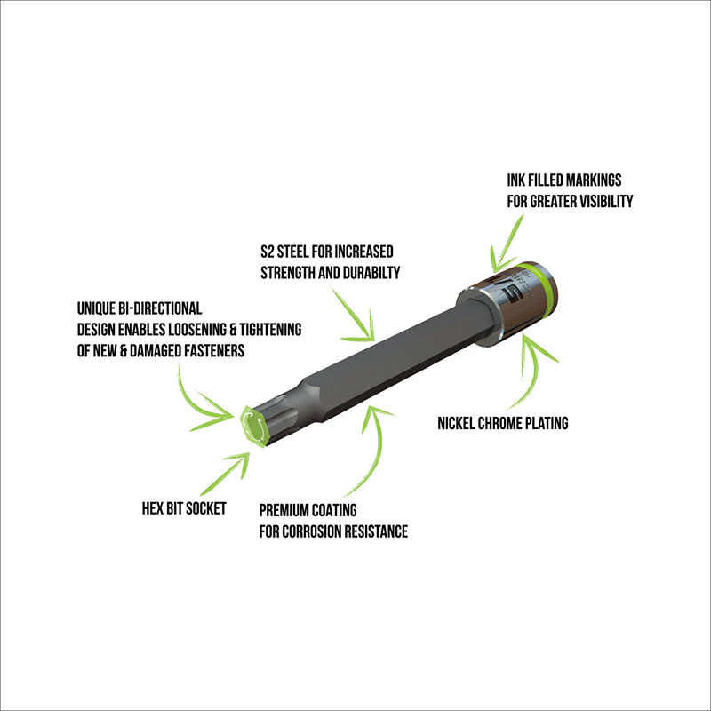 GRIPEDGE RPT (Rounding Prevention Technology) bits are designed to completely replace your traditional drive tools. With RPT bits, you can get up to 50% more torque on new/ good fasteners and up to 400% more torque on stripped/damaged fasteners vs traditional bits. In an emergency situation where you don't have a suitable replacement, RPT gives you the ability to reuse a damaged fastener and tighten it back down. Each bit is made from premium S2 steel for strength and durability, has oversized roll-stamped ink-filled size markings, and is coated with zinc phosphate for corrosion resistance. |
