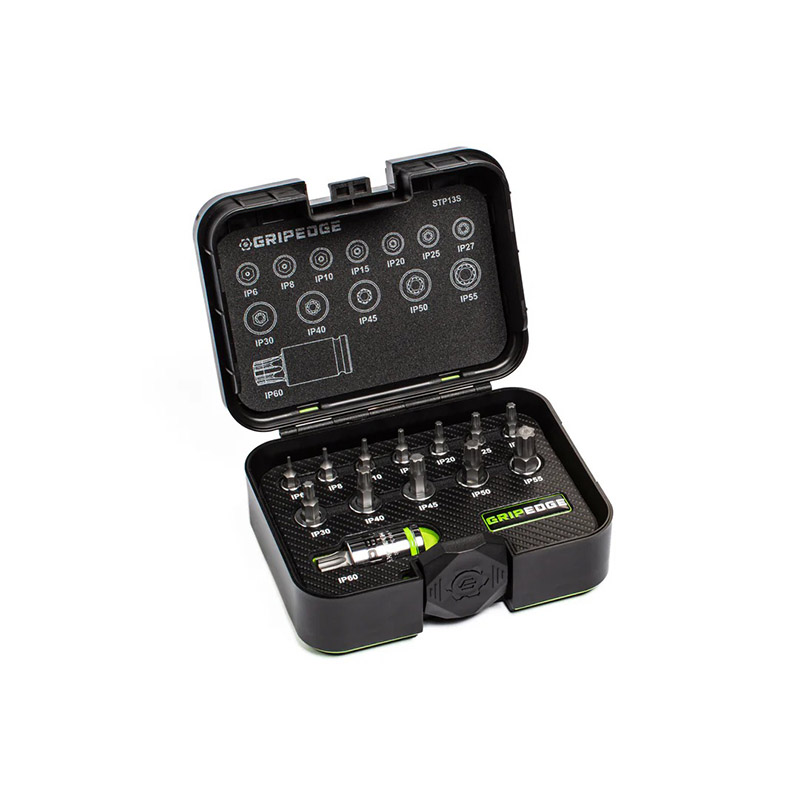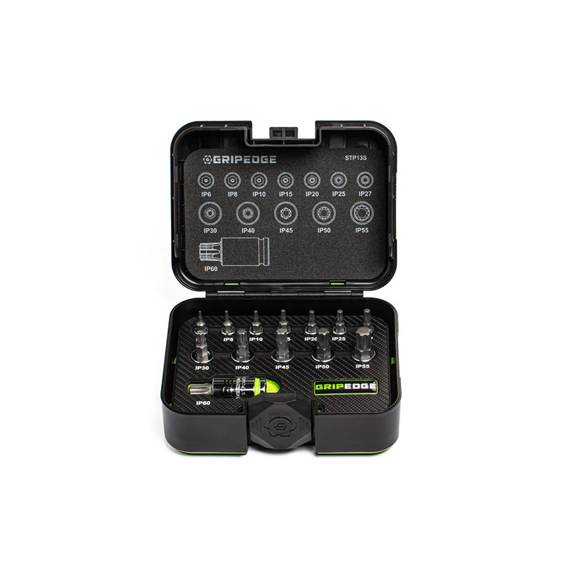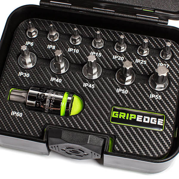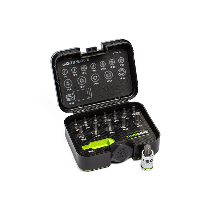 | Introducing the GRIPEDGE 13-PC Star Plus Driver Set with Rounding Prevention Technology (R.P.T.). These bit sockets, made from precision-machined S2 steel, offer up to 50% more torque on good fasteners and 400% more on damaged ones compared to standard tools. The patented bi-directional geometry prevents rounding and allows the removal of compromised fasteners. Features include oversize, roll-stamped ink-filled size markings, nickel chrome plating for corrosion resistance, and a premium plastic case with a removable foam insert. Sizes range from IP6 to IP60, ideal for most automotive applications. |