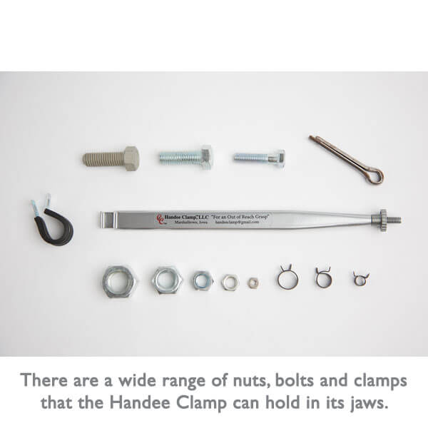 | This innovative tool solves the problem of that out of reach grasp. Have you ever been working on a job where you needed to put a clamp, nut, or bolt on something that was just out of reach of your fingers or another bulky tool? The Handee Clamp makes that job easy. Simply put that nut, clamp, or bolt on one end and then tighten the nut on the other end to secure. Designed to firmly hold nuts, bolts, and clamps in its easily adjustable jaws, the Handee Clamp acts as a small, versatile vise grip enabling you to focus on the job at hand. You won't have to worry about dropping that nut or bolt into that pesky floor drain ever again, or fight with that hose clamp as you work on that transmission line. From a professional auto or aviation mechanic, to a do-it-yourselfer that always has a project on deck in your garage at home, you need this tool in your inventory. |